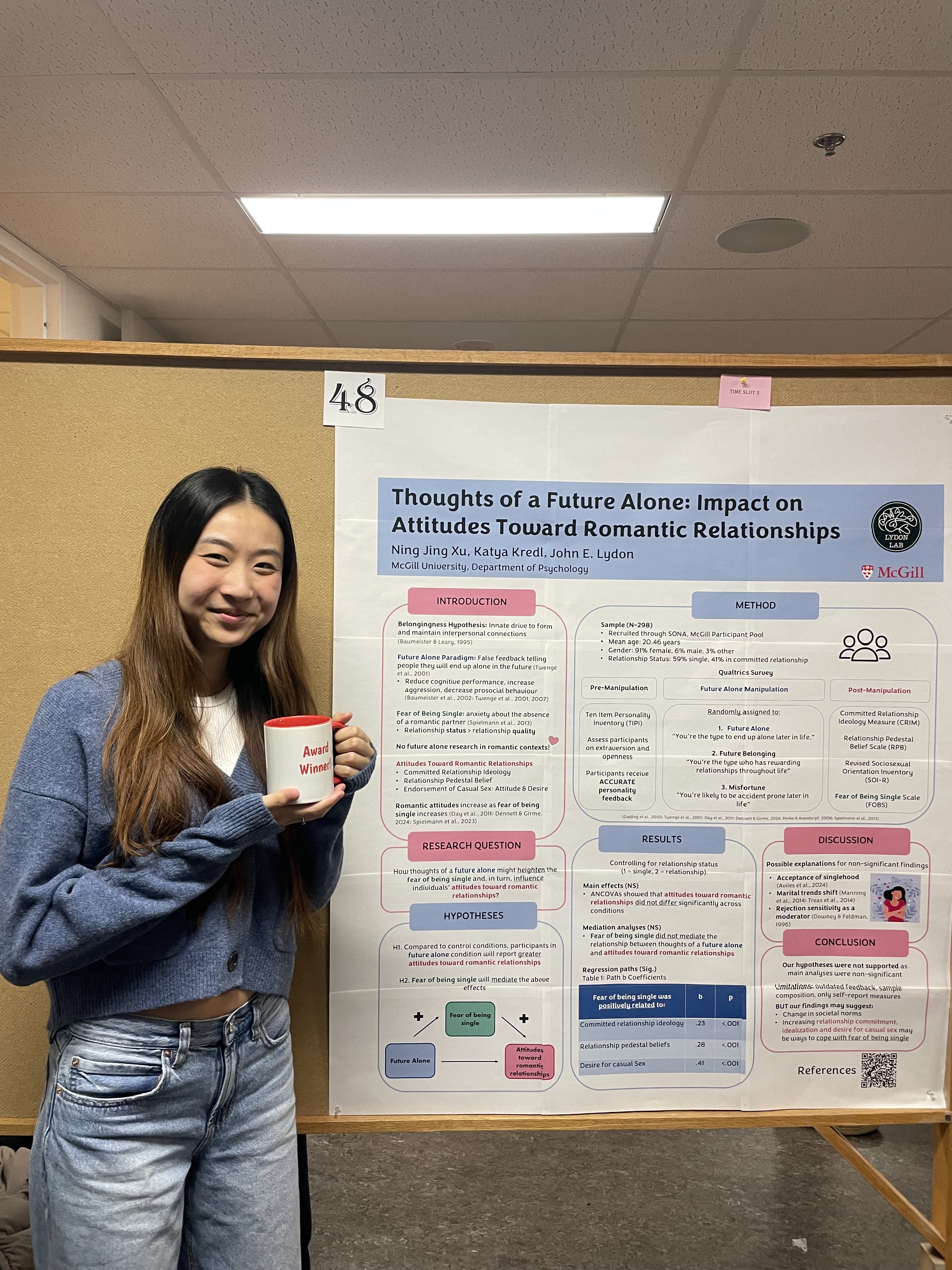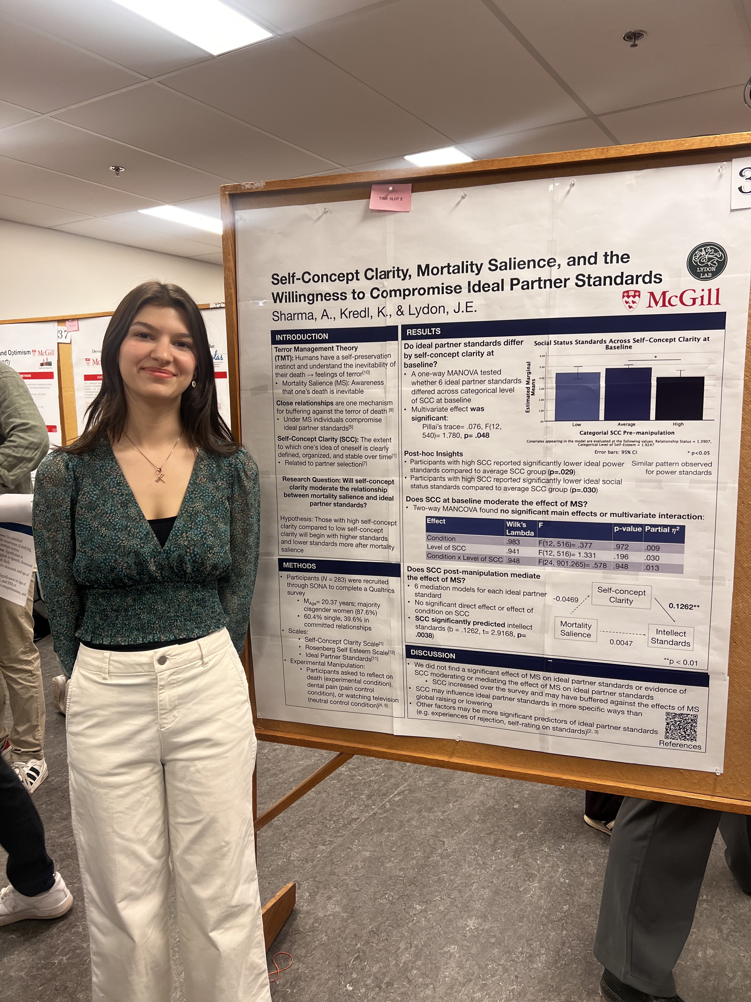 Our honours student Anjali Sharma presented her work on self-concept clarity, mortality salience, and the willingness to compromise ideal partner standards at the 2025 Psychology Undergraduate Poster Day.