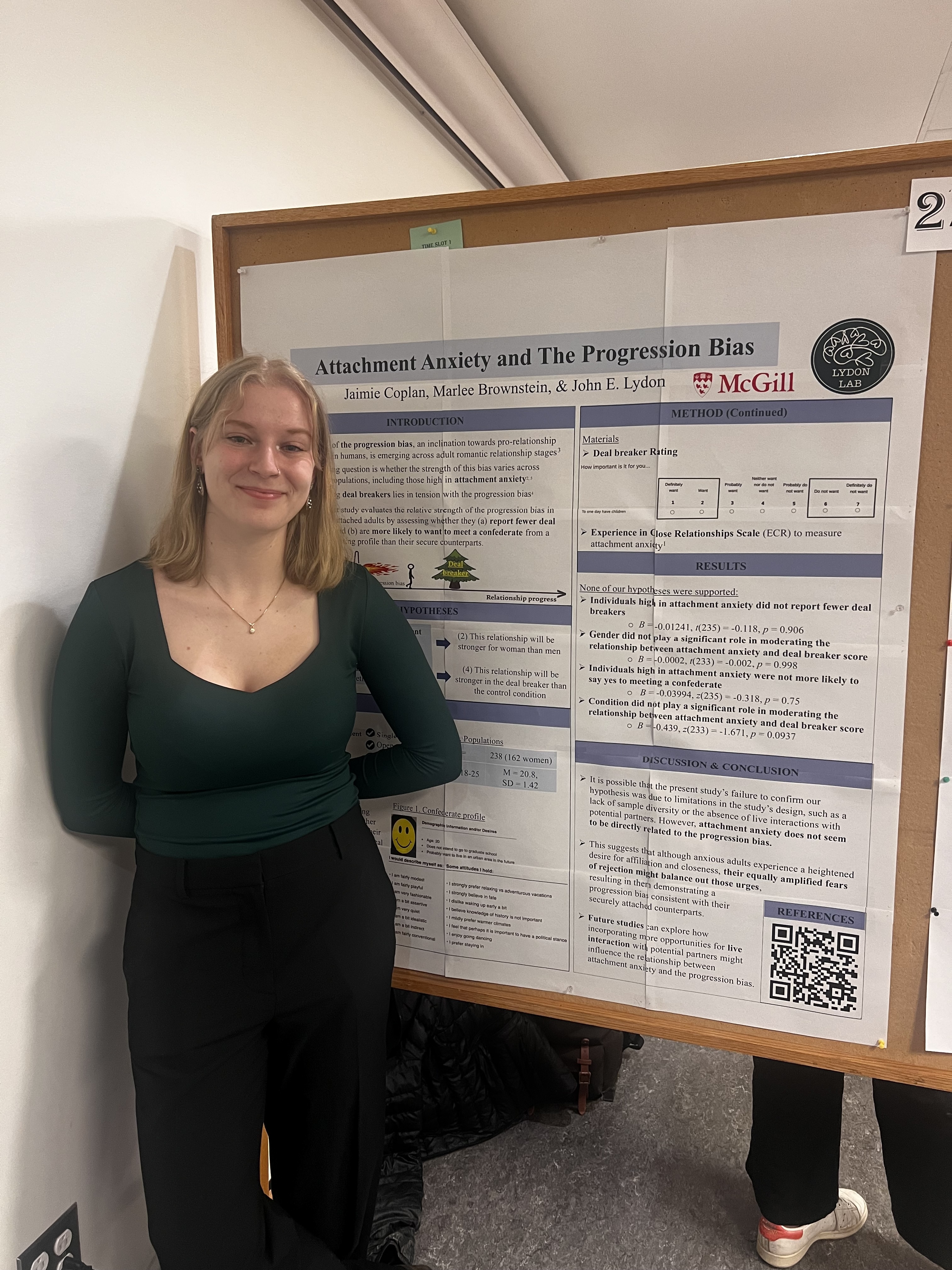 Our honours student Jaimie Coplan presented her work on attachment anxiety and the progression bias at the 2025 Psychology Undergraduate Poster Day.